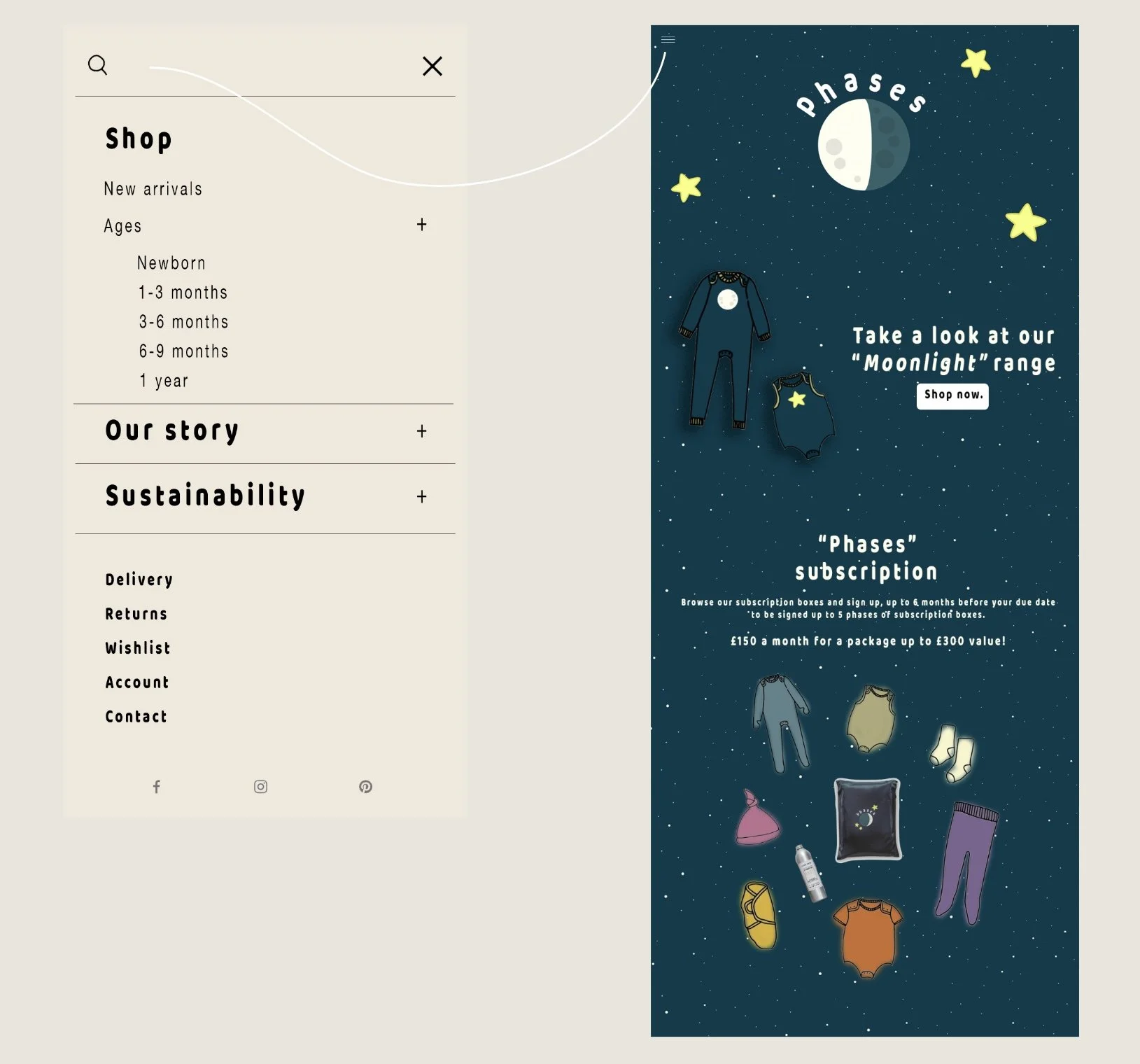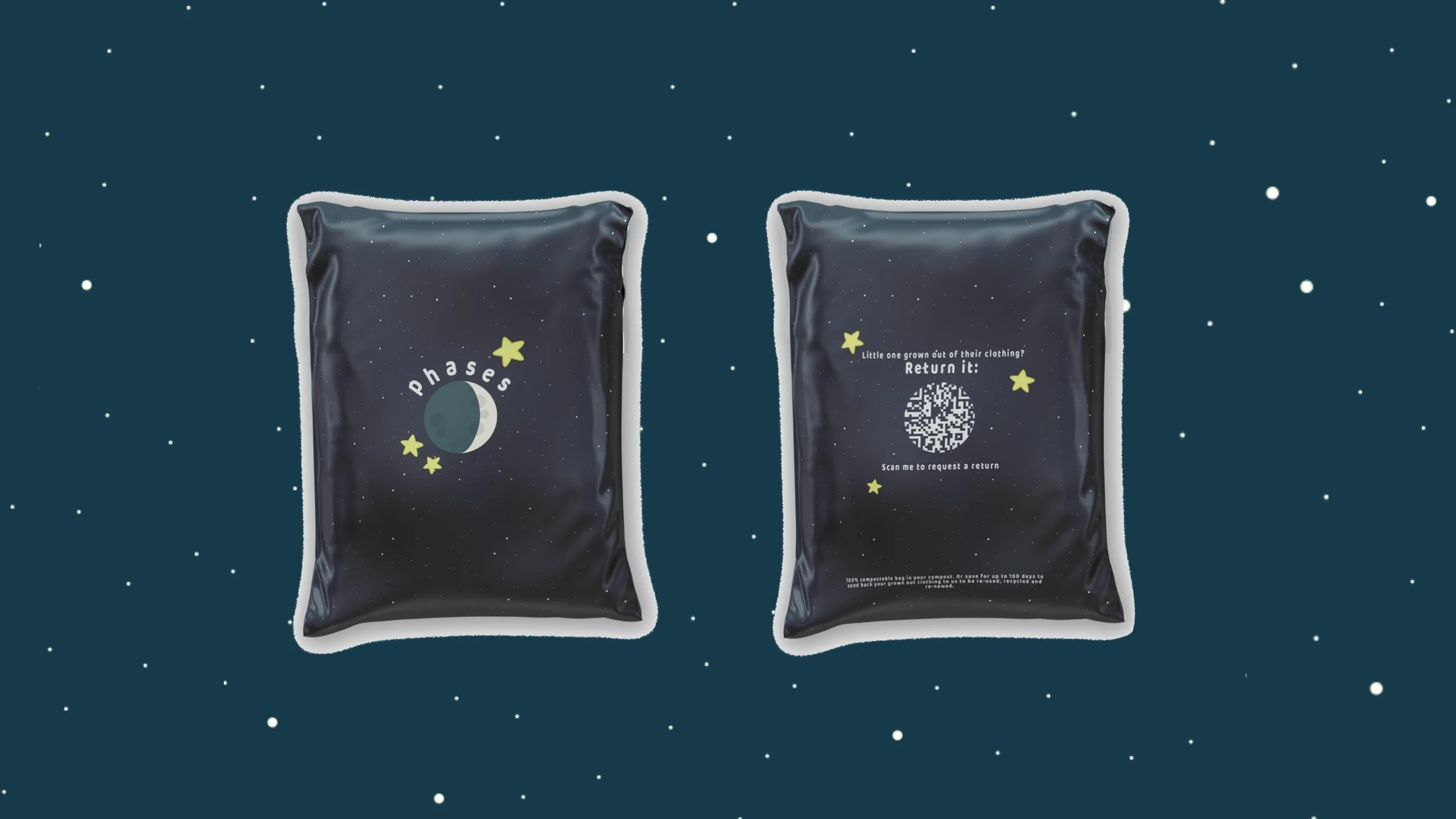 Phases uses a QR code, printed onto all garments and packaging, to educate customers on how they can help once their little one grows into our next size. Customers scan the QR code when they are ready to return the items, a link takes them through to the returns section of the Phases website where they order their child’s next clothing size, once the new subscription package arrives, the customer packages up the old size of garments in the new sizes packaging and posts them back to Phases. Subscriptions choose from three levels of bundle for each age range, as the volume of garments included in the bundle increases so does price. Phases then cleans, repairs, or reuses the fabrics and components for new subscriptions.